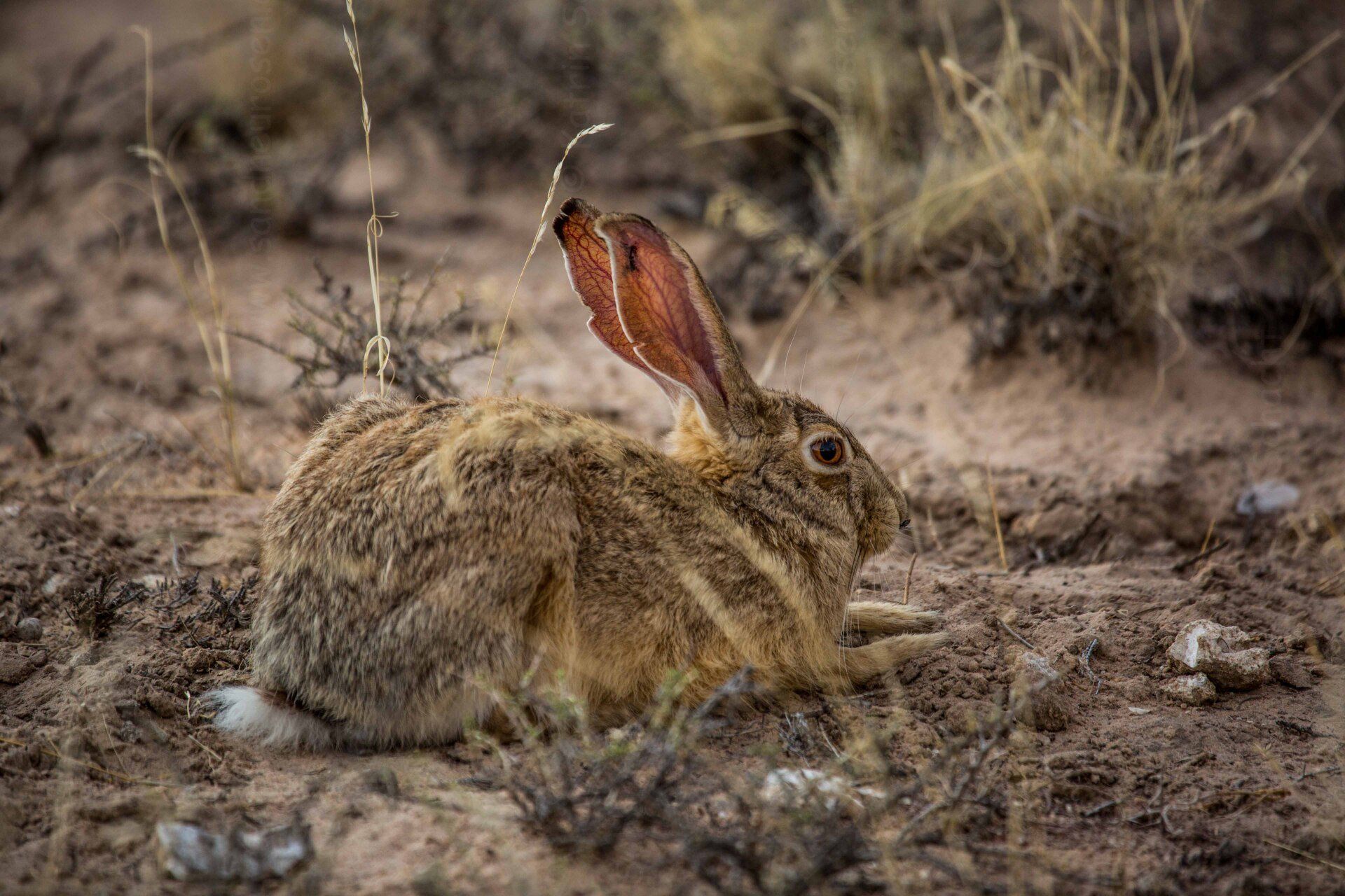 Ich suche mit dem Fernglas die Flächen ab, und dann plötzlich, waren da nicht eben 2 Ohren hinter einer kleinen Erhebung? Welches Tier kann bei dieser Gluthitze, ohne Schatten dort ausharren? Eine Hyäne, ein Löwe? Die Luft flimmert immer noch, war es doch nur eine Täuschung? Dann wieder…die Ohren, und dann auch der ganze Kopf.