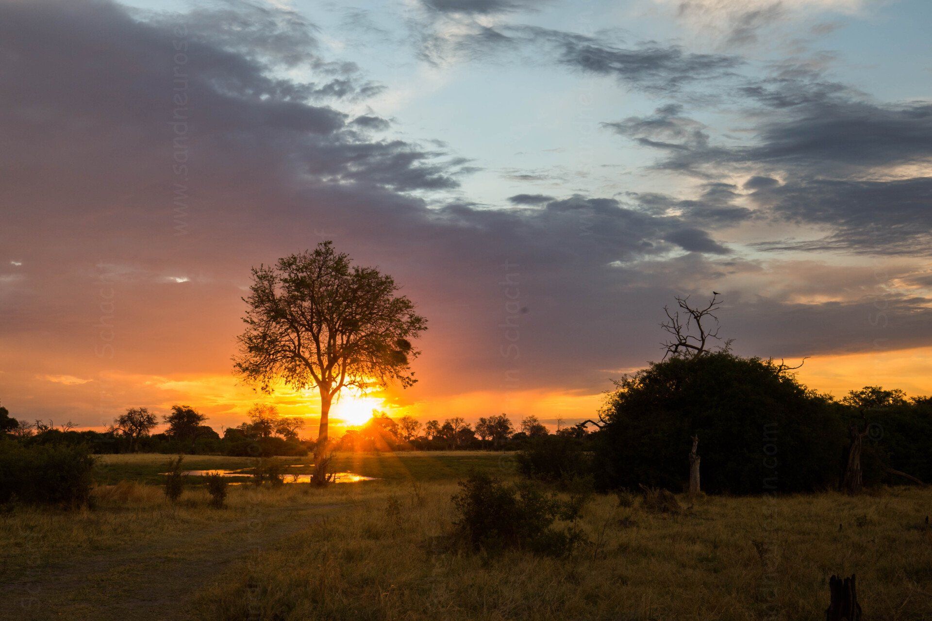 Die Katzen verziehen sich in die Büsche und in den Schatten. An den anderen Wasserlöchern haben sich neben den Gamedrive-Fahrzeugen auch Elefanten, Gnus, Warzenschweine und Impalas versammelt. Riesentrappen schreiten herum, als ob sie das alles nichts angehen würde. Der traumhafte Sonnenaufgang mit durchziehenden